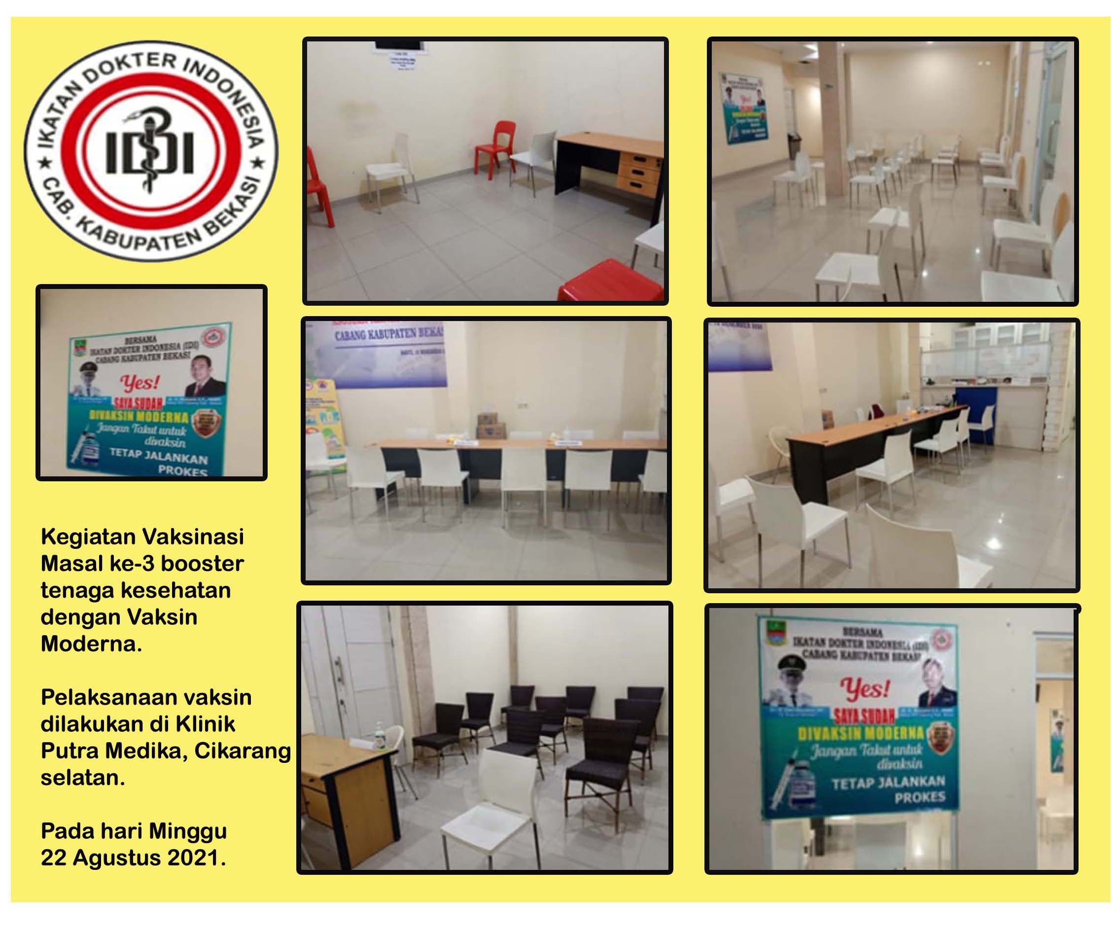 Berikut dapat kita saksikan dokumentasi (Video) kegiatan vaksinasi massal ke-3 booster tenaga kesehatanuntuk anggota IDI Cabang Kabupaten Bekasi dengan vaksin Moderna, kegiatan dilaksanakandi Klinik Putra Medika Cikarang Selatan pada hari Minggu, 22 Agustus 2021. sebagai catatan lagu pengiring vaksinasi pandemi berakhir adalah ciptaaan dr. Reno Yonora, Sp.An (salah satu anggota IDI Cabang Kab.Bekasi) video pelaksanan vaksin
