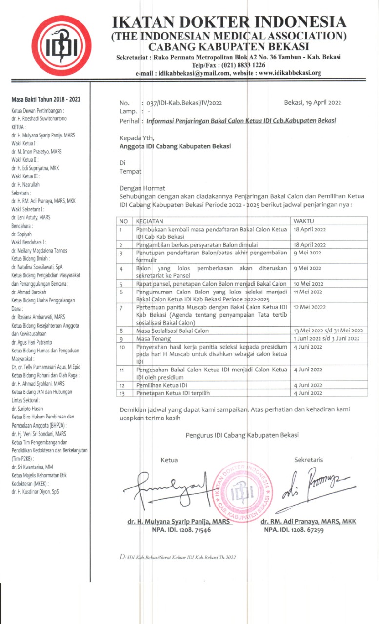 2. Tanggal 6 Oktober 2021 Pembukaan Pendaftaran, Bakal Calon Ketua IDI sudah dapat mengambil berkas persyaratan calon ketua IDI di Sekretariat IDI Kab. Bekasi / Download di website IDI Kab. Bekasi.