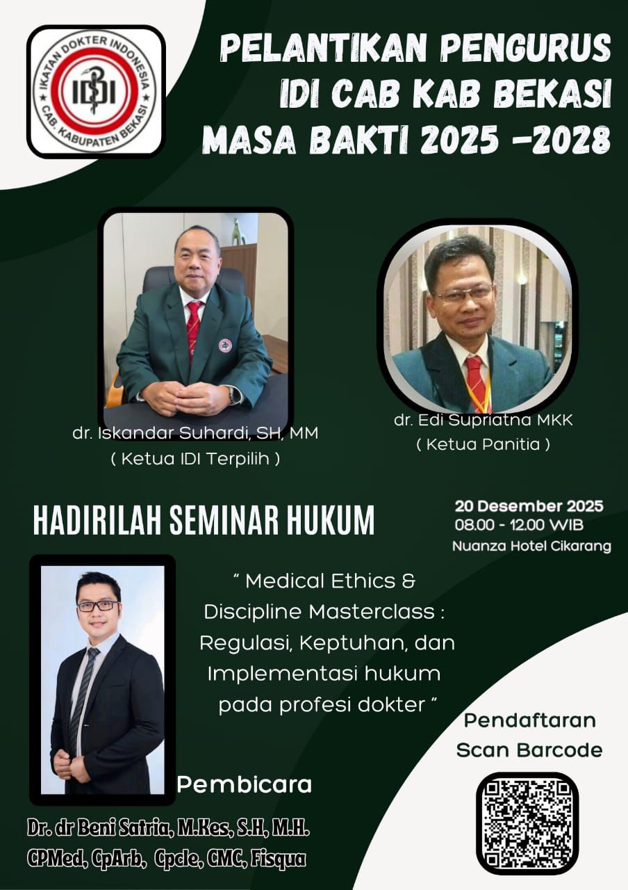 Pelantikan Pengurus IDI Cabang Kabupaten Bekasi Masa Bakti Tahun 2025-2028 , ketua terpilih : dr. Iskandar Suhardi, SH, MM dan Seminar “Medical Ethics & Discipline Masterclass : Regulasi, Kepatuhan, dan Implementasi Hukum pada profesi Dokter”dengan Pembicara : Dr. dr. Beni Satria, M.Kes, SH, MH, CPMed, CPArb, CPCLE, CMC, FISQua